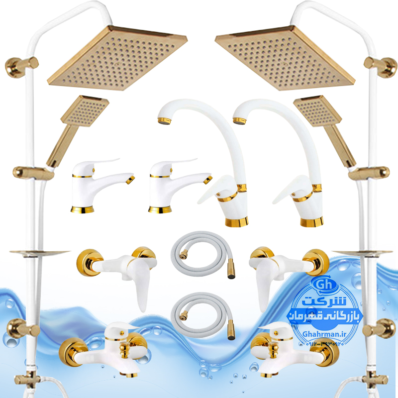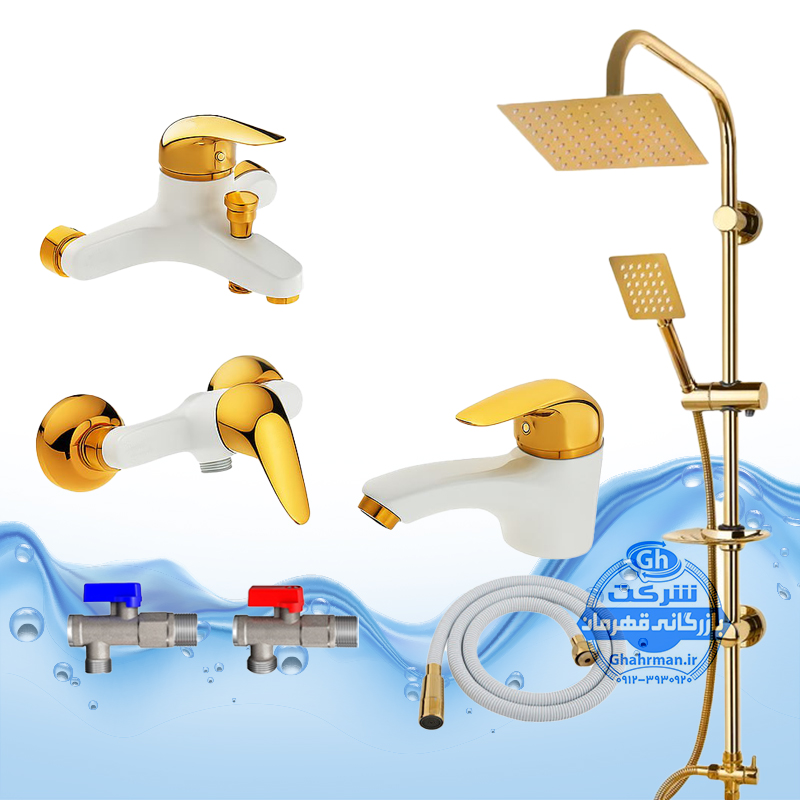 ست ۱۲ عددی شیرآلات برند آیدا صنعت مدل قهرمان اردکی | دو عدد شیر روشویی + شیر حمام + شیر توالت + علم دوش صفحه استیل + دو عدد شلنگ توالت + چهار عدد شیر پیسوار | سفید طلایی
