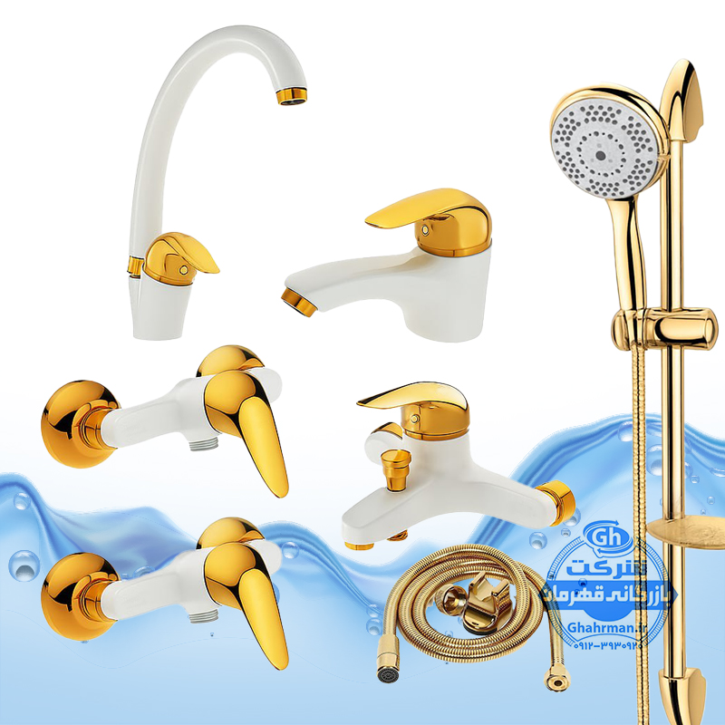 ست ۹ عددی شیرآلات برند آیدا صنعت مدل قهرمان اردکی | شیر ظرفشویی + دو عدد شیر روشویی پایهبلند + شیر حمام + دو عدد شیر توالت + علم دوش یونیکا + دو عدد شلنگ توالت | سفید طلایی