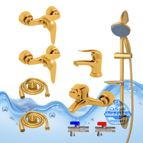 ست ۹ عددی شیرآلات برند آیدا صنعت مدل دنیز | شیر روشویی + شیر حمام + دو عدد شیر توالت + علم دوش یونیکا + دو عدد شلنگ توالت + دو عدد شیر پیسوار | طلایی مات