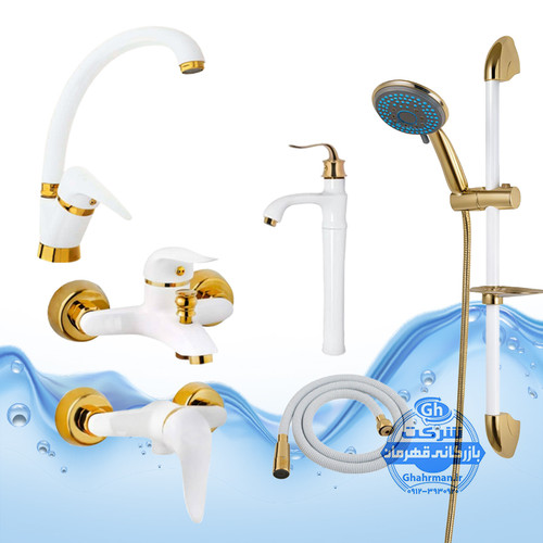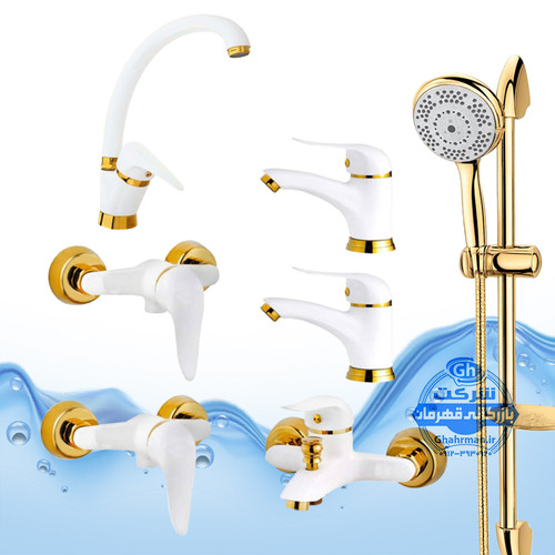 ست ۷ عددی شیرآلات برند آیدا صنعت مدل دنیز | شیر ظرفشویی + دو عدد روشویی + حمام + دو عدد توالت + علم دوش یونیکا | سفید طلایی