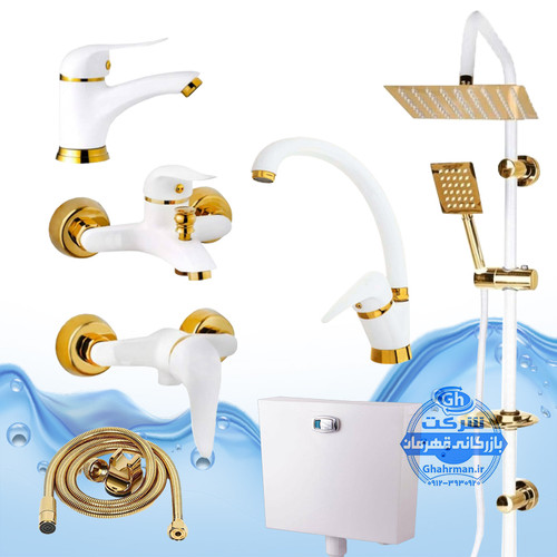 ست ۸ عددی شیرآلات برند آیدا صنعت مدل دنیز | شیر روشویی + حمام + دو عدد توالت + دو عدد شلنگ توالت + دو عدد پیسوار | سفید طلایی
