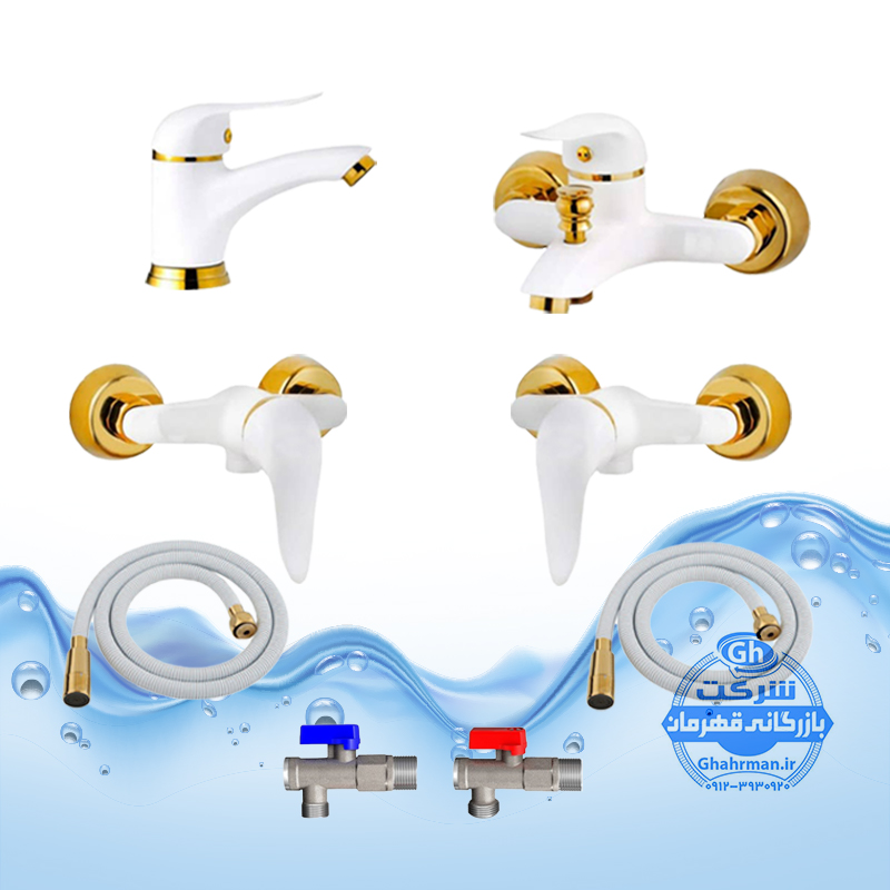 ست ۸ عددی شیرآلات برند آیدا صنعت مدل دنیز | شیر روشویی + حمام + دو عدد توالت + دو عدد شلنگ توالت + دو عدد پیسوار | سفید طلایی