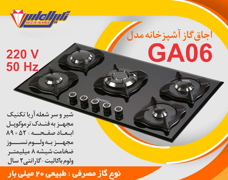 اجاق گاز صفحه شیشه ای نگین الماس کد GA06 ابعاد 52×89