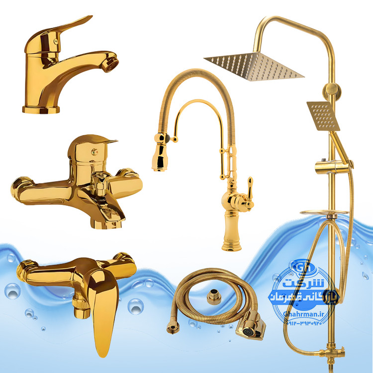 ست ۶ عددی شیرآلات برند آیدا صنعت مدل دنیز | شیر ظرفشویی بیزانس تکمنظوره + شیر روشویی + شیر حمام + شیر توالت + علم دوش صفحهاستیل + شلنگ توالت | طلایی براق