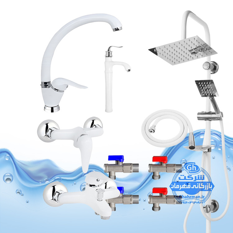 ست ۱۰ عددی شیرآلات برند آیدا صنعت مدل دنیز | شیر ظرفشویی + شیر روشویی پایهبلند مدل بامبو + شیر حمام + شیر توالت + علم دوش صفحه استیل + شلنگ توالت + چهار عدد شیر پیسوار | سفید کروم براق