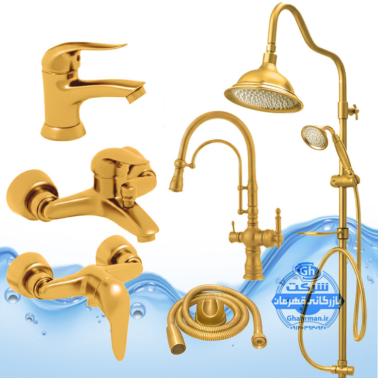ست ۶ عددی شیرآلات مدل دنیز | شیر ظرفشویی کلاسیک دومنظوره بیزانس + روشویی + حمام + توالت + شلنگ توالت + علم دوش شیپوری | طلایی مات