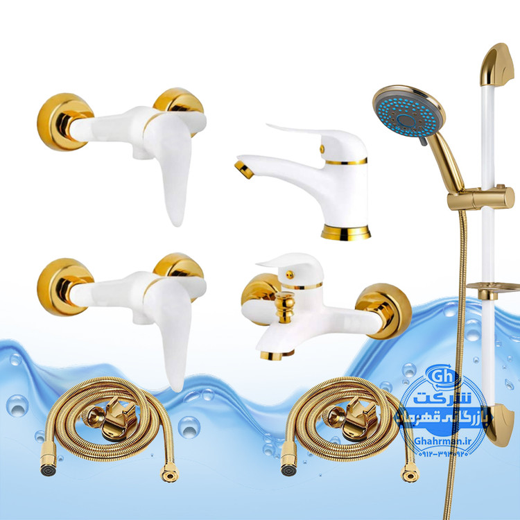 ست ۷ عددی شیرآلات برند آیدا صنعت مدل دنیز | شیر حمام + روشویی + دو عدد شیر توالت + علم دوش یونیکا + دو عدد شلنگ توالت | سفید طلایی