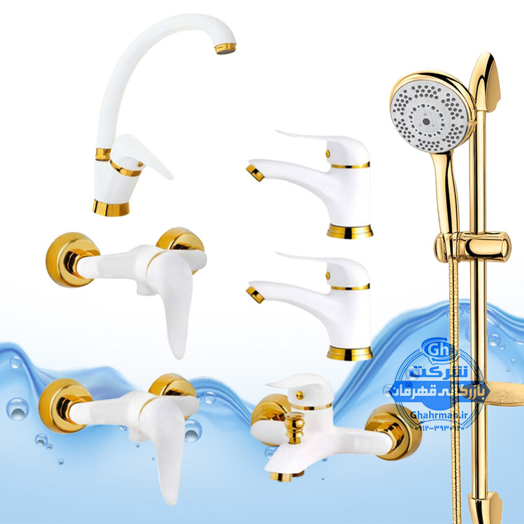 ست ۷ عددی شیرآلات برند آیدا صنعت مدل دنیز | شیر ظرفشویی + دو عدد روشویی + حمام + دو عدد توالت + علم دوش یونیکا | سفید طلایی