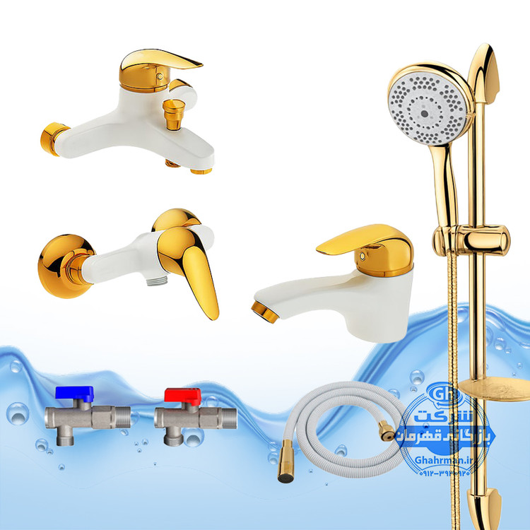 ست ۷ عددی شیرآلات برند آیدا صنعت مدل قهرمان اردکی | شیر حمام + روشویی + توالت + علم دوش یونیکا + شلنگ توالت + دو عدد پیسوار | سفید طلایی