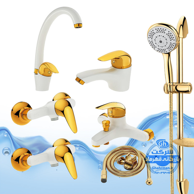ست ۷ عددی شیرآلات برند آیدا صنعت مدل قهرمان اردکی | شیر ظرفشویی + دو عدد روشویی + حمام + دو عدد توالت + علم دوش یونیکا + شلنگ توالت | سفید طلایی