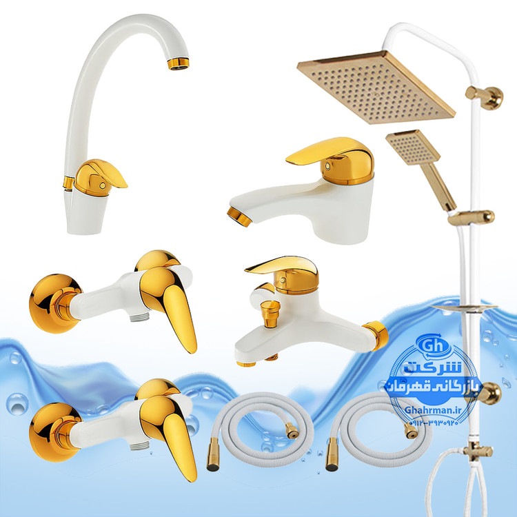 ست ۸ عددی شیرآلات برند آیدا صنعت مدل قهرمان اردکی | شیر ظرفشویی + روشویی + حمام + دو عدد توالت + علم دوش یونیورست صفحه استیل رسوبگیر اتومات + دو شلنگ توالت | سفید طلایی
